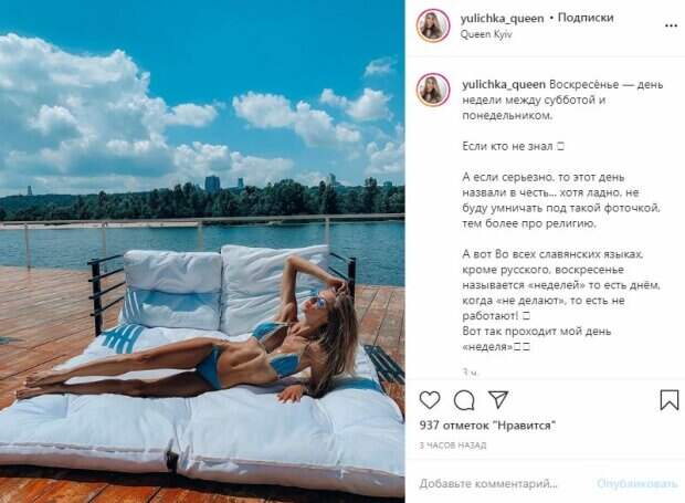 Тонкие бретельки натянулись на шее, не давая купальнику соскользнуть с прелестей. Юлианна лежала на боку, опираясь на руку и слегка выгнувшись. Шикарный пресс - вот, на что также нельзя насмотреться. Звезда закинула голову к небу и закрыла глаза. В посте модель рассказала о дне недели "воскресенье". "Во всех славянских языках, кроме русского, воскресенье называется «неделей» то есть днем, когда «не делают», то есть не работают! 😈 Вот так проходит мой день «неделя»👆😂", - написала Юлианна. За три часа пост собрал более 900 лайков и много комментариев. "Какая красивая!", "Я люблю тебя, крошка", "Фото на 5, текст на 3-", "Ох, как хороша", "Ты красивая и такая горячая 🔥🔥🔥🔥🔥🔥🔥💖💖💖💖💖💖", "Невероятная, королева, такая красивая!", "Великолепная 😍", - написали пользователи сети. Напомним, невеста Шабанова позировала в кожаном топе и шортах. Волосы красотка оставила распущенными, а образ дополнила кроссовками. Девушка показалась посреди клетки в ночном клубе, куда отправилась зажигать. Ранее сообщалось, что Юлианна была в лосинах и белом топе. Звезда показала свои новые кроссовки, стоя в профиль к камере, а также накаченные части тела. Напомним, пышногрудая невеста Шабанова показала в мини-купальнике свой загар А еще Politeka писала, что невеста Шабанова забыла о белье и показала, как радует своего чемпиона Также Politeka сообщала, что невеста Шабанова похвасталась идеальными изгибами в купальнике