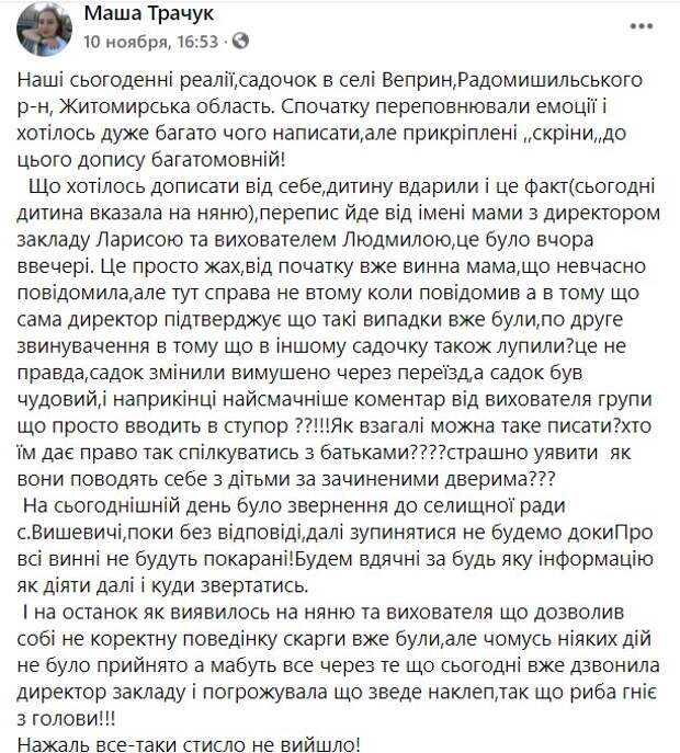 Воспитатели устроили родителям и детям травлю в детском саду Житомирской области Так, воспитатели и администрация детского садика села Веприн Радомышльского района Житомирской области устроила нешуточный буллинг относительно мамы и сына, позже стало известно, что такое произошло и с другими семьями.