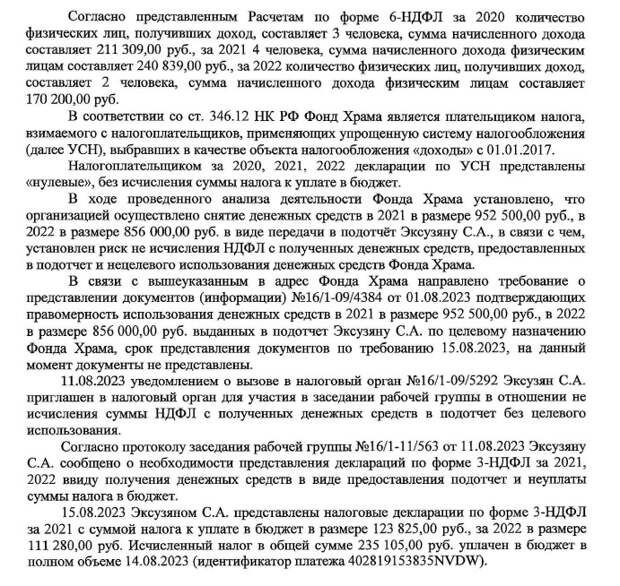 Сочи. Ранее Общественная служба новостей уже писала о сомнительной деятельности Сурена Эксузяна, который возвел постройки для использования в коммерческих целях на территории ФТ «Сириус». При этом Эскузян утверждал, что строит приют для малоимущих. Однако строительство, согласно документации, ведется уже больше десяти лет, а ни один из нуждающихся помощи так и не получил. Стоит отметить, что в ходе проверки выяснилось, что генеральный директор Фонда Сурен Эксузян уклонился от уставной цели и прибегнул к нецелевому использованию денежных средств Фонда. Как указано в решении по административному делу, деньги, которые были направлены на благотворительные цели, использовались для оплаты ЖКХ, аренды и других, не связанных с помощью страждущим услуг. Проверка Межрайонной инспекции ФНС №8 по Краснодарскому краю выявила, что Эксузян и руководство Фонда только за 2021 год сняли со счета деньги прихожан и жертвователей в размере 952 тысяч рублей. В 2022 году эта сумма составила 856 тысяч рублей. Все эти деньги были использованы на личные нужды Эксузяна и его приближенных. Документы в МИФНС по поводу расходования этих средств предоставлены не были, поэтому с них были заплачены налоги. Это является еще одним доказательством того, что руководители фонда присваивают деньги себе. По информации, содержащейся в документе, имеющемся в распоряжении редакции, за анализируемый период нет никаких документов, подтверждающих факты финансово-хозяйственной деятельности Фонда. Отсутствуют записи о расходовании денежных средств на оказание помощи гражданам, помощь нуждающимся и малоимущим в виде продуктов питания, одежды и обуви, медицинских препаратов, а также на приобретение продуктов питания для обедов для нуждающихся и выплату заработной платы. Стоит отметить, что «Фонд Храма Нерукотворного Образа Христа Спасителя» – не первый в списке Эксузяна. Он уже был главой подобной организации, по которой суд вынес решение о ликвидации. Однако Эксузян быстро сориентировался и создал новый фонд, прикрываясь религиозным названием. Руководство Фонда дошло до крайности и, пытаясь помешать правосудию, публикует лживые провокационные обращения к руководству страны в интернете, сочинских печатных изданиях и телевидении. Но правду не скрыть, большинство пользователей, возмущенных вызывающим поведением Сурена Эксузяна, пишут комментарии. Именно так выяснилось, что в приюте для бездомных никто не живет, однако деньги на содержание постояльцев собраны. Ответов ни от Эксузяна, ни от других представителей Фонда возмущенным гражданам дождаться так и не удалось. Минюст РФ сегодня занимается ликвидацией подобных лжефондов и ужесточает наказние за подобную деятельность. Таким образом вскоре Сурену Эксузяну и его команде может грозить ст.160 УК РФ – присвоение или растрата денежных средств. Сообщение «По делам его»: Создателя лжефонда для прихожан в Сочи могут отправить под суд появились сначала на Общественная служба новостей.