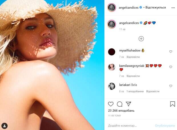 Красотка надела соломенную шляпку, которая сделала ее образ особенно соблазнительным. Стоит отметить, что кроме шляпки на модели больше ничего не было. Она впечатлила оголенными плечиками и едва не засветила грудь. Всего за 20 минут ее пост собрал почти 40 тысяч лайков. В комментариях ей оставили массу комплиментов. «Вау! Так потрясающе!», «Кенди, ты такая красивая», «Знаете, что во всем этом действительно крутого? Ощущение новизны», «Королева», «Глаза», «Летняя богиня», «Божественная!», «Ты как изумительное произведение искусства, о котором я мечтал как минимум 10 лет», - пишут пользователи сети. Ранее мы писали, что Кэндис Свейнпол соблазнила видом в белых шортиках и топе. Красотка дополнила образ полосатой рубашкой, которую приспустила с плеч. Волосы модель решила оставить распущенными. Она смотрела в кадр и была похожа на сказочную принцессу. Напомним, что роскошная Кэндис Свейнпол ничего не утаила под мокрым пеньюаром: "Богиня". Как сообщала Politeka, полностью раздетая Кэндис Свейнпол разожгла огонь страсти: "Люблю тебя!". Также Politeka писала, что Кэндис Свейнпол в смелом бикини остудила свой пыл в океане, подводные кадры: "Ты сможешь...".