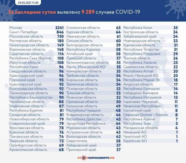 В России выявили 9 289 новых заболевших коронавирусом. Общее число заразившихся составило 5 053 748 человек, сообщает федеральный оперштаб. Выздоровели за сутки 9 250 человек. Всего в России переболели 4 670 484 человека. Зафиксирован за сутки 401 летальный исход. За весь период пандемии коронавирус унес жизни 120 807 россиян.