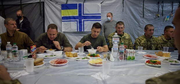 Офис президента Украины Владимира Зеленского вляпался в очередной скандал после визита главы государства на передовую. Так, пресс-служба опубликовала фото, где Зеленский сидит за одним столом с военными в компании с главой офиса Андреем Ермаком. При этом, на фото видно, что тарелки с едой стоят только перед Зеленским и Ермаком, а военные, скорее, выполняют функцию массовки, передает корреспондент «ПолитНавигатора».