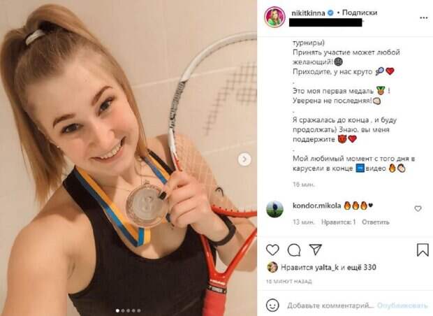 На другом фото актриса уже показалась возле сетки, демонстрируя свою фигуру в лосинах. Также красотка поделилась еще несколькими кадрами, как провела этот день. Об этом пишет Politeka.net со ссылкой на страничку знаменитости. "Это было феерически! Микст-турнир! 3 место", - написала звезда. "Это моя первая медаль! Уверена не последняя! Я сражалась до конца , и буду продолжать) Знаю, вы меня поддержите Мой любимый момент с того дня в карусели в конце видео", - поделилась впечатлениями Никитина. Мы писали, что известная актриса Екатерина Никитина, звезда «Квартал 95», рассмешила своих поклонников архивными кадрами. На своей странице в социальной сети Инстаграм девушка опубликовала видео, на котором показала, как оконфузилась, открывая бутылку шампанского. На записи звезда с подругой решили открыть игристый напиток, и эту почетную миссию взяла на себя Екатерина. Напомним, раздетая блондинка из "Женского квартала" предалась наслаждению на массажном столе А еще Politeka писала, что опасность настигла звезду "Квартал 95" прямо на сцене, момент попал на видео Также Politeka сообщала, что полураздетая красотка из "Женского квартала" поразила пикантным видео с "полицейской"