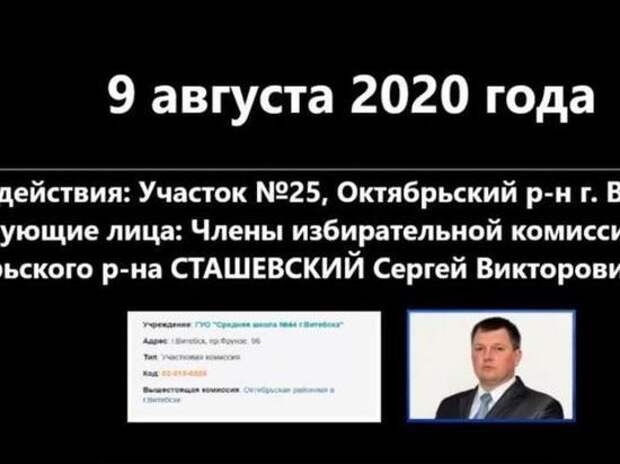 Председатель участковой избирательной комиссии в Витебске признал, что итоговый протокол голосования был переписан в пользу Александра Лукашенко, хотя изначально победу на этом участке одержала оппозиционный кандидат Светлана Тихановская. Об этом сообщает «Радио Свобода». Так, в интернете появилась запись разговора главы Октябрьской районной администрации Витебска Сергея Сташевского с членами участковой комиссии №25.