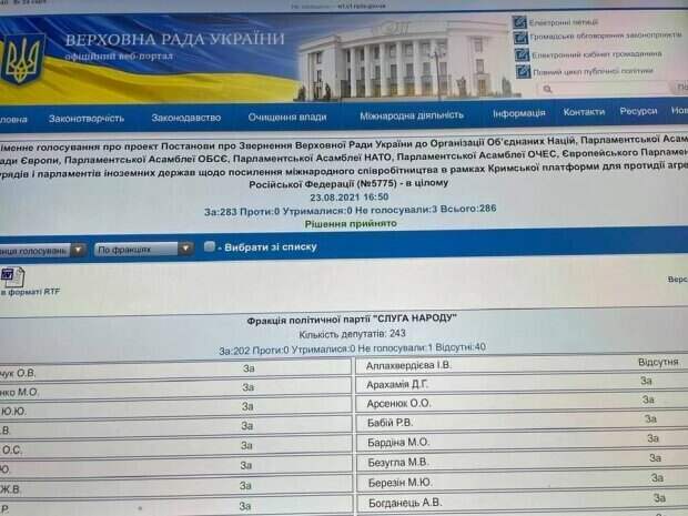 Важной составляющей борьбы за деоккупацию Крыма должно было стать постановление Верховной Рады Украины Об обращении ВР в ООН, ПАСЕ, ОБСЕ...об усилении международного сотрудничества в рамках Крымской платформы для противодействия агрессии Российской Федерации. За нее проголосовали 283 депутата, хотя понятно, что весомую государственническую и парламентскую легитимность украинской позиции по агрессии России предоставила бы конституционная, то есть в более 300 голосов большинство! С партией Медведчука все понимало - они на призыв Путина не пришли на заседание парламента. Но безответственность других фракций и групп шокирует! Слуга народа-отсутствуют или не голосовали 41 депутат из 243; Родина - отсутствуют или не голосовали 10 депутатов из 25 во главе с Тимошенко; ЕС-отсутствуют или не голосовали 5 депутатов из 27 во главе с Парубием; За будущее - 12 из 22 во главе с палкой; Доверие-9 из 20 во главе с Кулиничем и Иванчуком; Голос - 5 из 20 во главе с Рахмініним… Попутно напомню, что последнее пленарное заседание Верховной Рады состоялось ... 16 июля?! Поэтому было время у уставших депутатов отдохнуть до 23 августа! А во время очередных политических или предвыборных дискуссий они снова будут рвать на себе рубахи и кричать, что Крым - это Украина и обещать, что в следующем году мы проведем парад в Севастополе, а день крымскотатарского народа в Бахчисарае