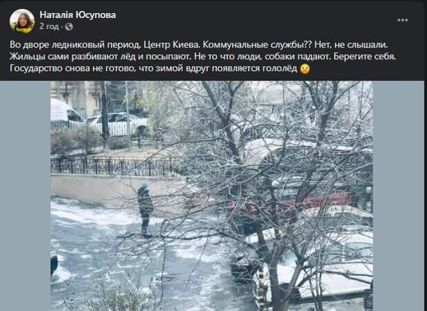 Волонтер и блогер Наталья Юсупова высказалась о "ледяном коллапсе" в Киеве Как передает Politeka.net, эмоциями от пережитого она поделилась на своей страничке в Facebook. "Во дворе ледниковый период. Центр Киева. Коммунальные службы?? Нет, не слышали. Жильцы сами разбивают лёд и посыпают. Не то что люди, собаки падают", - поделилась волонтер.
