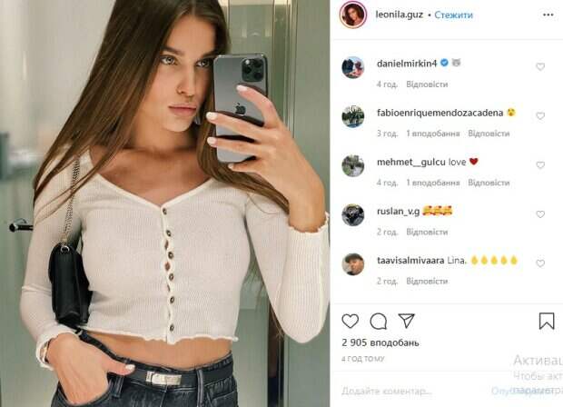 Дополняли образ знаменитости элегантная сумочка и красивый макияж. Это стало причиной бурных комментариев со стороны ее поклонников. «Вау, крошка», «какая кицька», «уматовая», «суперовая», «глазки суперовые», «красотка», «божественный вид», «на такую красоту можно смотреть вечно», «ну до чего же хороша, черт возьми», «вот смотрю и понимаю, за что ты стала Мисс Украина», — пишут они. До этого мы писали, что 21-летняя модель, Мисс Украина-2018, Леонила Гузь нашла способ привлечь внимание публики На этот раз звезда впечатлила формами без нижнего белья, соответствующее фото Леонила выложила в своем микроблоге в Инстаграм. Юная модель предстала на черно-белом снимке в темном платье. Красотка застыла в эффектной позе, спустив лямки на плечи и оголив шикарный бюст. Невозможно не заметить, что Гузь не стала сковывать прелести тесным лифчиком. Напомним, Мисс Украина Леонила Гузь показала безупречное декольте в томной позе Также Politeka писала, что Мисс Украина Леонила Гузь без одежды оседлала стул, показав свою красоту А еще Politeka сообщала, что Мисс Украина Леонила Гузь едва втиснула прелести в тесную маечку