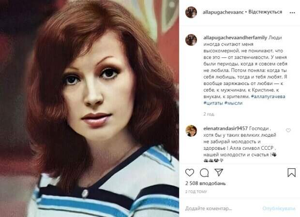 Cеть "взорвало" архивные фото легендарной певицы Аллы Пугачевой в молодости Как сообщает Politeka.net, фото Примадонны появились в социальной сети "Инстаграм". Портретное фото запечатлело молодую Пугачеву с каштановыми волосами. Она проникновенно смотрит в кадр большими глазами. «Люди иногда считают меня высокомерной, не понимают, что все это — от застенчивости.