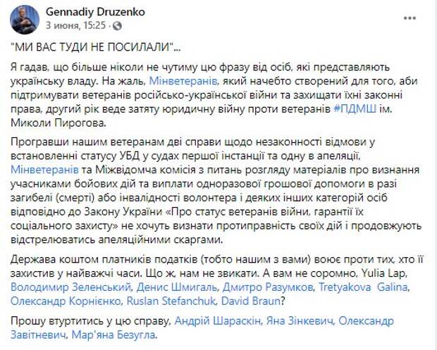 Правозащитник и общественный деятель Геннадий Друзенко в соцсети Фейсбук озвучил свою позицию по поводу уровня поддержки ветеранов в нашей стране Приводим слова автора без изменений. Я думал, что больше никогда не буду слышать эту фразу от лиц, представляющих украинскую власть. К сожалению, Минветеранов, которое будто создано для того, чтобы поддерживать ветеранов российско-украинской войны и защищать их законные права, второй год ведет ярую юридическую войну против ветеранов #ПДМШ им. Николая Пирогова. Проиграв нашим ветеранам два дела о незаконности отказа в установлении статуса УБД в судах первой инстанции и в апелляции, Минветеранов и Межведомственная комиссия по вопросам рассмотрения материалов о признании участниками боевых действий и выплаты одноразовой денежной помощи в случае гибели (смерти) или инвалидности волонтера и некоторых других категорий лиц в соответствии с Законом Украины «О статусе ветеранов войны, гарантии их социальной защиты» не хотят признать противоправность своих действий и продолжают отстреливаться апелляционными жалобами.