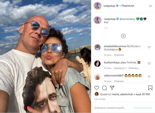 Репер надел интересную футболку, на которой изображен мужчина, а Настя прильнула к мужу и изобразила губы в поцелуе. Всего за час фотография набрала свыше 20 тысяч лайков. Пользователи заинтригованные комментируют увиденное. «Красавчики! И небо, отражаясь в линзах, радовалось вам и своему отражению❤️», «На троих😂😂😂», «Что за третий мужик ? Потап присмотрись жена обнимает не тебя😂😂😂😂», «Прикольная фотка. Вас будто трое)», «"А что за мужик с вами? », - пишут люди. До этого сообщалось, что знаменитая украинская певица Настя Каменских показала, как веселится в Одессе на яхте. Сразу после отпуска в Турции звезда отправилась для продолжения отдыха в Одессу. Там Настя решила блеснуть фигурой в белом бикини, за которое ранее ее серьезно раскритиковали. На новых кадрах Настя блеснула формами во всей красе - в том же белом бикини и выпрямившись перед объективом, чтобы восхитить длинными ножками. Настя позировала без макияжа и лишних украшений. Напомним, что мокрая Каменских завела утренним фото в купальнике, вид впечатляет: «Фигура богини». А еще Politeka писала, что счастливая Каменских в тонком белом платье поделилась важной новостью: "Наконец-то! Дождались...". Также Politeka сообщала, что Настя Каменских рассказала правду о своей жизни: "Измены, пластика и звездная болезнь".