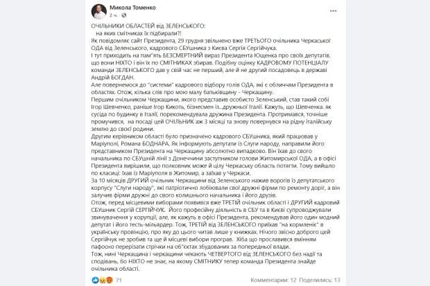 что они никто и он их по помойкам собирал. Подобную оценку кадровому потенциалу команды Зеленского дал в свое время не первый, но и не второй чиновник в государстве Андрей Богдан. Но вернемся к "системе" кадрового отбора глав ОГА, которые являются лицом Президента в областях. Итак, несколько слов о моей малой родине-Черкасщине. Первым главой Черкасской области, которого представил лично Зеленский, стал некий Игорь Шевченко, ранее Игорь Кикоть, бизнесмен из...дружественной Италии. Говорят, что Шевченко. как соседа по дому в Италии, порекомендовала жена Президента. Продержался, точнее промучился, на посту это глава аж 3 месяца и снова вернулся на родную итальянскую землю к своей семье. Вторым руководителем области был назначен кадрового СБУшника, который работал в Мариуполе, Романа Боднара. Как информируют депутаты из Слуги народа, направили его представителем Президента на Черкасщину совершенно случайно. Он ехал к своему начальнику по СБУшной линии из Донетчины заместителем председателя Житомирской ОГА, а в офисе Президента решили, что полковник может и целую Черкасскую область утащить. Поэтому получилось по классике: ехал из Мариуполя в Житомир, а заехал в Черкассы. За 10 месяцев второй глава Черкасской области от Зеленского нажил врагов из депутатского корпуса "Слуги народа", которые патриотически лоббировали свои дружественные фирмы по ремонту дорог, а он привлек фирмы дружественные к своему бывшему начальнику и его друзьям. Итак, перед местными выборами появился уже третий глава области и второй кадровый СБУшник Сергей Сергейчук. Его профессиональную деятельность в СБУ и в Киеве сопровождали обвинения в коррупции, но, как говорят в офисе Президента, рекомендовал его один модный депутат и его тесть-миллиардер. Поэтому, третий от Зеленского приехал "на кормление" в украинскую провинцию, о которой до этого читал только в книгах. Ничего конечно хорошего этот Сергийчук не сделал да еще и местные выборы проиграл. Разве что прославился умением пафосно перерезать ленты на объектах построенных при предыдущей власти. Поэтому, сейчас Черкасщина и Черкасщины ждут четвертого от Зеленского без надежды и надежд, потому что никто не знает, на какой помойке теперь команда Президента найдет главу области.