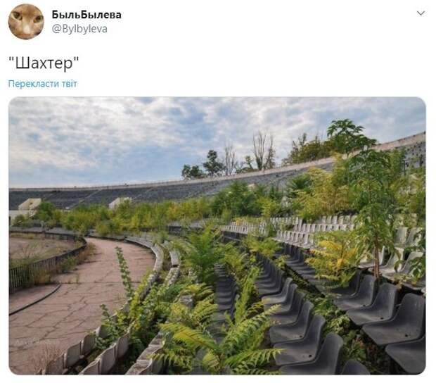 Стадион футбольного клуба "Шахтер" в Донецке без ухода превратился в настоящие джунгли Как сообщает Politeka.net, в социальной сети "Твиттер" показали красноречивое фото запустения на большой спортивной арене. На территории оккупированного Донбасса продолжается война, поэтому местным жителям не до футбола.