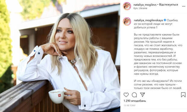 Известная украинская певица Наталья Могилевская пришла в ужас от результатов своего небольшого эксперимента Как передает Politeka.net, недавно певица предложила всем, кто потерял работу во время локдауна прислать резюме ей на несколько интересных вакансий. «Ошибка, из-за которой люди не могут добиться успеха!
