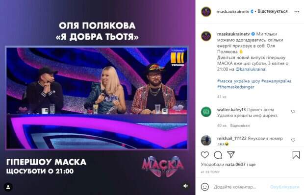 На странице проекта в Instagram опубликовали забавный видеофрагмент с Поляковой, где она общается с участником, который прячется за маской. В ролике модно увидеть, как Оля обращается к милому Циклопу, который стоит на сцене, пытаясь отгадать, кто скрывается за маской. Полякова нежным голосочком говорит "Я добрая тетя, видишь, я улыбаюсь", - игриво говорит певица. Однако Циклоп ей детским голоском отвечает: "Я вам не верю". После этого в Полякову как будто вселился Янукович – она хватает карандаш и со злостным лицом ломает его пополам, раскидывая ошметки, которые летят в Данилко. В это время за кадром Дзидзьо говорит: "Пошла по стопам бывшего президента". В подпсии к видеоролику говорится: "Мы только можем догадываться, сколько энергии таит в себе Оля Полякова. Смотрите новый выпуск гипершоу МАСКА уже в эту субботу, 3 апреля в 21:00 на @kanalukraina!". Конечно же пользователи принялись обсуждать забавное видео и саму Олю Полякову, высказывая мнения о ее поведении на шоу. Напомним, Данилко с Мейхер утерли нос Поляковой на шоу "Маска": "Давай 500 гривен!". Как сообщала Politeka, Каменских раскусила брутального Сома на шоу "Маска" и не смогла держать себя в руках: "Единственное, что выдало. ..". Также Politeka писала, Данилко сразу же разгадал, кто Луна на шоу "Маска", и поставил на место Полякову: "Михайлович, браво!".