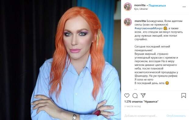 «Я не раз говорила, что фразой: Вы будете вспоминать школу, как лучшее, что было в вашей жизни; учителя явно манипулировали. Не бывает хуже - лучше, есть реальность и наше отношение. Но, Если бы учителя объяснили это правило раньше , наверное у многих жизнь сложилась бы иначе… Ну а всем, Кто завтра снова столкнется с школьными реалиями, желаю сил, адекватности и... дышите глубже», - написала Монро. Она также поделилась новым снимком, на котором позирует в непривычно строгом образе. На ней простая голубая рубашка, крупные украшения и макияж в розовых тонах. При этом вместо традиционного блонда на голове Монро красуются непривычно рыжие волосы нежного персикового оттенка. Поклонники красотки активно комментируют ее пост. «Тебе очень идёт этот цвет!», «Цвет волос красивый и не только», «Рыжуха», - пишут люди. Напомним, травести-дива Монро впечатлила редким кадром из прошлого, красотку не узнать: «Лиса Алиса». Как сообщала Politeka, знойная Монро без белья заставила краснеть рискованным декольте. Также Politeka писала, что травести-дива Монро прогулялась в экстремальном мини под дождем: "Великолепная".