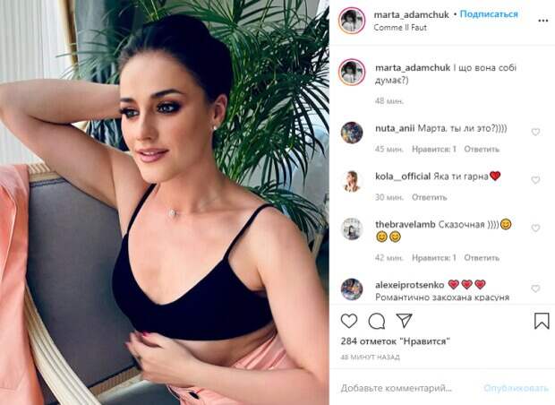 Девушка позировала в кресле, приняв томную позу. Адамчук соблазнительно изогнулась, запрокинув руку за голову. Яркий макияж и минимум украшений дополнили ее роскошный образ. "И что она себе думает?)", - подписала фото звезда. Пользователи кинулись обсуждать увиденное, засыпав Марту комплиментами в комментариях: "Марта, ты ли это?))" "Яка ти гарна❤️" "Сказочная ))))😊😊😊" "Романтично закохана красуня💗" "Неймовірна!😍" Ранее мы сообщали, Марту вже раздевалась, эпатируя публику. При чем красотка сделала это, будучи в гостях. Жгучая брюнетка расположилась в кожаном кресле, на спинке которого, видимо, висел пиджак или кофта, от чего Адамчук с легкостью избавилась. На ней был черный лифчик и легкие светлые брюки с темным орнаментом. Звезда продемонстрировала стройную фигуру, одарив зрителей очаровательной улыбкой. Пользователи кинулись комментировать: "Очень красивая😍😍😍"; "Прекрасна, Мартуся💖"; "Где-то кофту потеряла"; "Радость ❤️"; "Дiвчина-мрiя"; "Ну какая же Вы чудесная!!И как Вы поете.....❤️❤️🔥". Также мы рассказывали, Марта изумила внешним видом в красном длинном платье на опубликованных в Инстаграм кадрах. Девушка спускалась по лестнице и на вопрос подруги и коллеги Веры Кекелии, идущей позади, "куда собралась", кокетливо ответила "замуж выхожу". Напомним, знойная брюнетка из «Квартал 95» свела с ума ярким образом с пикантной деталью: «Обворожительная». Как сообщала Politeka, счастливая Кекелия после родов прыгнула с мужем в постель, видео: "Раньше падали в лепестки роз, а теперь..." Также Politeka писала, что роскошная брюнетка из "Квартал 95" поразила ангельским образом.