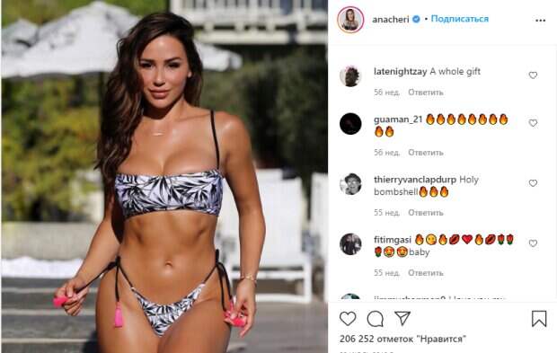 Американская фитнес-модель Ана Чери повеселилась на отдыхе в новом бикини Ана умеет привлечь аудиторию к своим постам в социальной сети Инстаграм. Девушка постоянно показывает себя в новых образах, рекламирует коллекцию своей спортивной одежды и показывает, как занимается в ней на природе. Так как Ана предпочитает ленивый отдых и постоянно посещает пляж, на ее странице в социальной сети все больше ярких фото в бикини.
