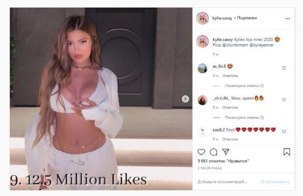 Фото получилось очень соблазнительным и эффектным. На других кадрах девушка показала себя и свою семью. Об этом пишет Politeka.net со ссылкой на фан-страничку знаменитости. "Лучшие фото Кайли 2020", - написано под публикацией. Фанаты поставили более 9 тысяч лайков и написали комментарии: "Вау, королева", "Но некоторые из ее новейших фотографий получили более 9 миллионов лайков", "Она так быстро растет", "Королева социальных сетей", "Действительно топ 2, а она не 2", "О, МОЙ БОГ!! Кайли - королева. У нее лучшие посты 2020 года со всеми этими лайками", "Красивая и фантастическая". Мы писали, что известная модель и бизнесвумен Кайли Дженнер обожгла своими формами, обтянутыми красной тканью. В этот раз Кайли надела сверкающее длинное платье, которое сияло от света. Звезда подчеркнула тканью пышные объемы. Пышная грудь притягивала взгляд, как и округлые бедра. Кроме того стильное платье подчеркнуло тонкую талию. Напомним, томная Кайли Дженнер в коже загипнотизировала сочными "персиками" А еще Politeka писала, что Кайли Дженнер вышла на прогулку без лифчика и заставила глотать слюнки Также Politeka сообщала, что раздетая Белла Хадид страстно сжала свои "черешенки"