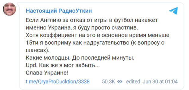 Звезда российского ТВ рассказал, что хочет увидеть победу подопечных Андрея Шевченко в этой игре над англичанами в 1/4 финала. Он похвалил украинских игроков, которые бились до последней минуты, и оценил наши шансы на успех в поединке с одной из самых сильных команд. "Если Англию за отказ от игры в футбол накажет именно Украина, я буду просто счастлив. Хотя коэффициент на это в основное время меньше 15 я восприму как надругательство (к вопросу о шансах). Какие молодцы. До последней минуты. Upd. Как же я мог забыть… Слава Украине!" – написал Уткин. Василий Уткин также пошутил, что знает, как упали акции главного тренера российской сборной Станислава Черчесова. Тот перед началом Евро-2020 отмечал, что шансы у украинцев и российской сборной – на равных. Однако произошло не так и украинцы оказались значительно сильнее, а Россия вылетела из Евро на последнем месте группы. Напомним, Украина вырвала путевку в четвертьфинал ЕВРО-2020. Как сообщала Politeka, футболисты сборной Украины не сдержали эмоций после победы над шведами. Также Politeka писала, что Яремчук и Степаненко устроили безумные танцы после победы над шведами.