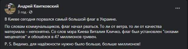 Со слов мэра Киева Виталия Кличко, флаг был установлен "силами меценатов" и обошёлся в 47 миллионов гривен. P. S. Видимо, для надёжности нужно было больше, больше миллионов!", - сообщил Андрей Квитковский на своей страничке в Facebook. Согласно комментарию коммунальной службы столицы, флаг по неизвестным причинам начал рваться. Предполагают, что случилось это либо же из-за сильного ветра, или из-за плохого материала, из которого было сшито полотнище. В сети не поверили в такую версию, а во всем обвинили действующего мэра столицы. "Девиз: деньги на ветер - в действии!", "Это плохой знак", " Мост стеклом трещит, трубы рвёт, асфальт пипец, а тут и флаг рвется!! Вывод один, за что Кличко не возьмется, сп**дит и оно порвётся!!!", "Ничего, новый поставим", - писали пользователи сети. Стоить отметить, что были и оправдательные комментарии в сторону Виталия Кличко: Кличко разгневал киевлян оправданием за плохие дороги: "В наследство получили". "Пациентам больно, а врачей задолбало": харьковчанам показали километр позора Кернеса. "На три с минусом": харьковчанин показал, как в городе "капитально" ремонтируют улицы.