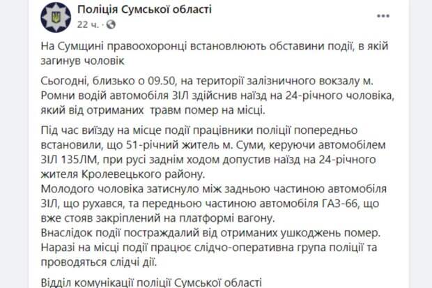 Правоохранители сообщают, что трагедия произошла во вторник, 28 сентября, около 9:50 утра на территории железнодорожного вокзала города Ромны. При выезде на место происшествия сотрудники полиции предварительно установили, что 51-летний житель Сум, управляя автомобилем ЗИЛ 135ЛМ, при движении задним ходом допустил наезд на 24-летнего жителя Кролевецкого района. Вячеслава Квокша зажало между задней частью двигающегося ЗИЛа и передней частью ГАЗ-66, который уже был закреплен на платформе вагона. Его буквально раздавила военная техника. Он получил травмы не совместимые с жизнью. В настоящее время обстоятельства смерти выясняются. Вячеслав Квокша 1996 года рождения. Проживал вместе с родителями в селе Буйвалово. В 2017 году призван сначала на срочную военную службу, а затем на службу по контракту. В сети украинцы оставляют слова сочуствия родным и близким солдата: "Трудно поверить в то, что произошло. Боль утраты жжет душу родителям, родственникам, односельчанам. Искренние соболезнования родным", "Вечная память и Земля пухом! А родным соболезнования", "Сочувствую родным и близким. Держитесь". Напомним, оборвалась жизнь выдающегося украинца, страна потрясена. Как сообщала Politeka, умер известный украинец. Также Politeka писала, что остановилось сердце выдающегося украинца, который месяц боролся с вирусом.
