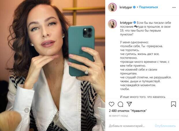 Дополнила новую фотографию Кристина своими рассуждениями о том, что можно было бы пожелать себе 19-летней. "Если бы вы писали себе послание туда в прошлое, в свои 19, что там было бы первым пунктом? У меня однозначно: полюби себя, ты - прекрасна; не спеши; не суетись, жизнь даст все, постепенно; проводи много времени с теми, с кем тебе приятно; не изменяй себе и своим принципам; не слушай сплетен, не разрушайся; живи, дыши и путешествуй; наслаждайся моментом; люби. И еще много того, что, казалось, можно отложить на потом! А у вас? Расскажите, каким было бы ваше письмо к себе, той юной девочке?!" - обратилась она к фолловерам. В комментариях фолловеры Кристины поддержали ее в большинстве пунктов, а также написали свои вариации писем к себе 19-летним. Также много кто отметил, что не стоит откладывать все на потом. "Покупай доллар по 4,60", - пошутил супруг Горняк Владимир Остапчук. Напомним, новая жена Остапчука решилась на публичное противостояние с его бывшей женой Как сообщала Politeka, новая жена Остапчука резко обратилась к украинцам после роскошной свадьбы с Сердючкой Также Politeka писала, что новая жена Остапчука сделала признание о детях, мать которых бросил ведущий
