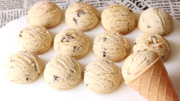 Влейте растительное масло и снова перемешайте. Добавьте большую часть просеянной муки, тщательно перемешайте. Шоколад нарежьте мелкими кубиками и соедините с тестом. Затем постепенно добавьте еще муки. Должно получиться рассыпчатое тесто, которое должно хорошо держать форму, если его сжать рукой. С помощью ложки для мороженого сформируйте печенье. Выпекать печенье около 10-15 минут в хорошо разогретой до 180 ℃ духовке. Подробный рецепт песочного печенья смотрите в видео: