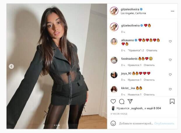 Красотка на нескольких кадрах позволила оценить образ со всех сторон. Фанаты сразу начали комментировать публикацию: "Вдохновение", "Огонь", "Моя девушка влюблена", "Красиво и замечательно!", "Самая лучшая красивая идеальная девушка", "Я твоя большая фанатка", "Самый красивый человек в мире", "Ты самые захватывающие что я когда-либо видел", "красивая девушка, пришлите мне фото в бикини", "Любовь моей безумной жизни". Сообщалось, что известная модель Жизель Оливейра устроила съемку на пляже. На отдыхе на Гавайях девушек удалось устроить жаркую съемку на закате, очаровывая видом в маленьком купальнике на завязках, верх которого едва держится на бюсте девушки. Напомним, Жизель Оливейра из «Victoria’s Secret» в дерзком мини восхитила своим видом А еще Politeka писала, что Жизель Оливейра из "Victoria’s Secret" в мини показала фигурку со всех сторон Также Politeka сообщала, что Жизель Оливейра из «Victoria’s Secret» в прозрачной сеточке показала свою красоту
