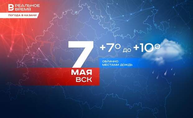 В воскресенье, 7 мая, в Казани ожидается переменная облачность, дождь и туман. Такой прогноз дали в Гидрометцентре Татарстана. Днем в Казани ожидается от +7 до +10 градусов. В целом по Татарстану прогнозируется от +7 до +12°С. Также синоптики прогнозируют в Казани северо-западный ветер порывами до 6—11 м/с.