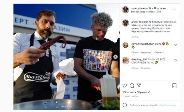 Не забывает Арсен и об Инстаграм, где делится с фанатами своим творчеством и личными кадрами. На новых фото Арсен показал, как занялся готовкой интересного блюда. Мирзоян решил приготовить осьминога, с которым ему помогли разобраться испанские друзья. Мастер-класс проходил под открытым небом, а певец показал все этапы приготовления блюда. "Осьминог жареный. Мастер-класс от испанских друзей", - написал артист под фотографиями, которые опубликовал у себя на страничке в Инстаграм. Напомним, муж Тони Матвиенко Мирзоян распустил седые волосы, вызвав переполох в сети А еще Politeka сообщала, что полностью поседевший муж Тони Матвиенко Мирзоян всколыхнул украинцев новым фото Также Politeka писала, что жену Мирзояна Тоню Матвиенко в бирюзовом платье заподозрили в беременности