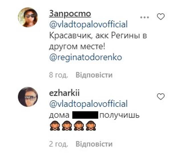 «Доброе утро, как спалось? Вид из окна конечно потрясающий», - игриво подписала фото звезда. Ее фото собрало почти 300 тысяч лайков. В комментариях ей оставили больше четырех тысяч отзывов, но особое внимание привлек комментарий российского певца, мужа Регины Тодоренко из "Орла и решки" Влада Топалова. Артист оставил под фото смайлики обезьянок с закрытыми глазами, что стало поводом для бурных комментариев. «@vladtopalovofficial что, понравилась?», «обезьянки так себе подкат», «я все расскажу Регине», «резиновые сиськи первый раз увидел?», «Красавчик, акк Регины в другом месте!», «дома *** получишь», - пишут пользователи сети. Ранее мы писали, что Самбурская покорила роскошным образом. Актриса снялась для мужского журнала Maxim. Красотка позировала в белом халатике, черных колготках и лабутенах. Она застыла в пикантной позе, задрав ножку. Кроме этого, недавно Самбурская попала в скандал, посмеявшись над зарплатами пожарных. Девушку спросили, вышла бы она замуж за пожарного, на что она ответила, что им не хватит его зарплаты на жизнь. Напомним, что Настасья Самбурская ошарашила пикантной позой с "папиком": "Задний план решает". Как сообщала Politeka, скандальная звезда "Универа" Самбурская в мини-шортиках ошарашила образом Лары Крофт: "Превзошла Джоли". Также Politeka писала, что Харламову нашли эффектную замену фигуристой Кошкиной и Асмус, фото красотки Самбурской: "Сердцеедка".