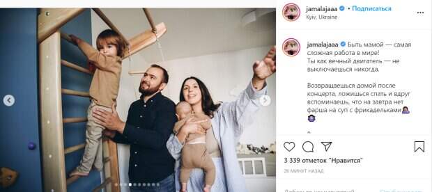 На своей странице в Instagram звездная мама опубликовала трогательные кадры в кругу семьи. На фото можно увидеть старшего сына певицы, двухлетнего Эмира-Рахмана, младшего Селима-Гирая и ее мужа Сеит-Бекира. На фото Джамала запечатлена в домашнем костюме с широкими рукавами и с красиво уложенными кудрями волосами. Она нежно держит на руках младшего сына, а старший сидит рядом и целует братика в лоб. На других снимках можно увидеть всю семью певицы вместе: муж Джамалы Бекир страхует старшего сына, двухлетнего Эмира-Рахмана, пока маленький проказник лезет вверх по шведской стенке. А сама исполнительница держит новорожденного малыша, с улыбкой наблюдая за старшим сыном - материнство ей действительно к лицу. В подписи к трогательным снимкам Джамала написала, что быть мамой - это самая трудная профессия в мире, но при этом та, которая приносит в жизнь больше всего счастья. "Быть мамой — самая сложная работа в мире! Ты как вечный двигатель — не выключаешься никогда", - написала певица и рассказала, что часто вспоминает о своих малышах на концертах или во время интервью. Пользователи сети засыпали семейство умиленными и душевными комментариями. "Вы очень красивая мама люблю вас и желаю вам детишек как на небе звездочек", "Божжеее, какие вы милые, просто невероятно