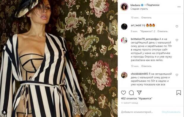 Российская ведущая и актриса Эвелина Бледанс впечатлила публику экстравагантным видом Как сообщает Politeka со ссылкой на страничку знаменитости в Инстаграм, девушка стоит на фоне ярких обоев, из одежды на ней лишь корсет телесного цвета, не скрывающий аппетитной груди актрисы, полосатый халат небрежно накинут на ее тело, но не запахнут, поэтому фолловеры получили возможность насладиться изгибами тела Эвелины.