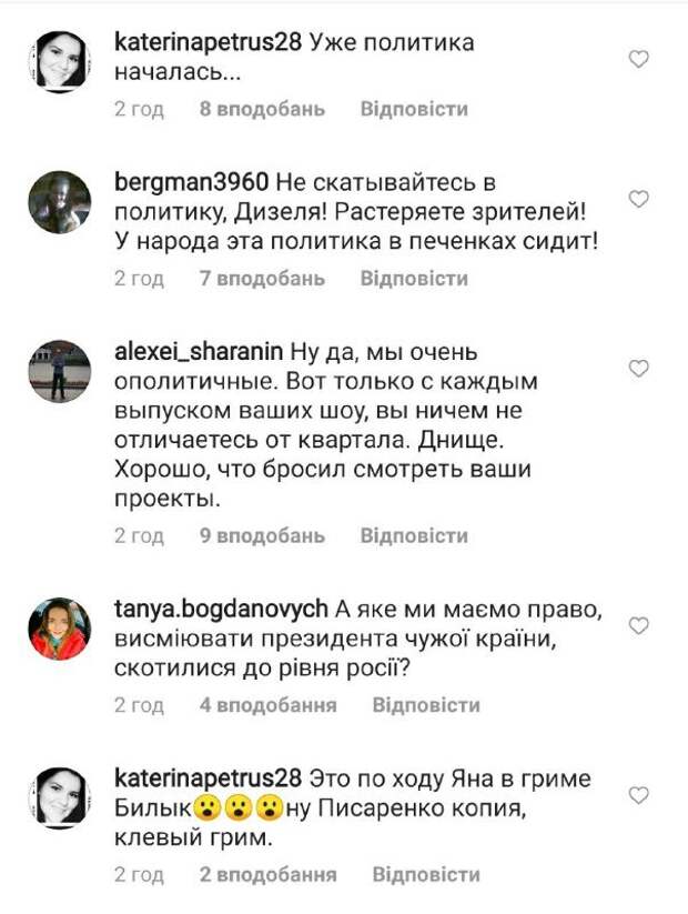 Роль Лукашенко в постановке сыграл, очевидно, актер студии Сергей Писаренко. Он вышел на сцену в дорогом костюме с приклеенными усами и в парике. Выглядит актер так, что действительно сложно отличить от настоящего белорусского президента. Точно так же и с актрисой, которая сыграла Ирину Билык, поклонники решили, что это Яна Глущенко, хотя отличить ее от настоящей звезды просто невозможно. Девушка вышла на сцену в атласной зеленой блузке, поверх которой надела яркий желтый пиджак, свой образ она дополнила белокурым париком, огромными очками и шляпой. В подписи к публикации говорится: "Мы обещали вам сенсации? Вот и одна из них! СМИ сообщили, что украинская певица Ирина Билык выступила на новогоднем приеме одиозного президента Беларуси Александра Лукашенко. Новость буквально взорвала СМИ. Авторы «Dizel Night» решили пофантазировать и представить, как же все происходило на самом деле". Поклонники не остались равнодушны и принялись активно обсуждать новые фото с концерта "Дизель шоу". "Ну да, мы очень аполитичные. Вот только с каждым выпуском ваших шоу, вы ничем не отличаетесь от квартала. Днище. Хорошо, что бросил смотреть ваши проекты", "Это по ходу Яна в гриме Билык, ну Писаренко копия, клевый грим", "О, началось. .. Что будет дальше, в ВР пойдете от зели или пороха?", - пишут в комментариях. Напомним, Звезда "Дизель Шоу" Крутоголов заткнул за пояс скандального Моргенштерна, видео: "Какое заразное…". Как сообщала Politeka, Загадочная Булитко из "Дизель шоу" заинтриговала заявлением: "Никому не расскажу о...". Также Politeka писала, Звезда "Дизель шоу" поразил неожиданным перевоплощением в королеву Елизавету: "Супер".