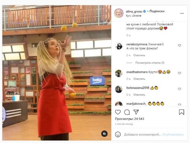 В этот раз Алина опубликовала ролик, в котором появилась с дредами и в красном фартухе "МастерШефа". В руках Гросу держала апельсины, которыми жонглировала под собственную песню. И стоит отметить, что у девушки очень хорошо выходило. "Мамина помощница на кухне в деле. Смотрите один из новых выпусков. "Хороший тамада и конкурсы интересные. Оля Полякова и Татьяна Решетняк - лучшая команда в мире и хоть у меня нет свекрови, но опыт совместного времяпрепровождения на кухне с любимой Поляковой стоит гораздо дороже", - написала Алина под кадрами. "Классненько. Красота", "Ого, класс", "Молодец. Талантливый человек, во многом талантлив", "Пчелка-жонглер", "Умничка и супер леди!!! Не каждый так сможет покрасоваться!", "Умничка. А что за трек фоном?". Напомним, Гросу раскрыла всю правду о себе, такого никто не ожидал А ще Politeka писала, что Алина Гросу, которая недавно развелась, обратилась к украинцам за советом Также Politeka сообщала, что разведенная Гросу разозлила украинцев новой сменой внешности, перестают узнавать