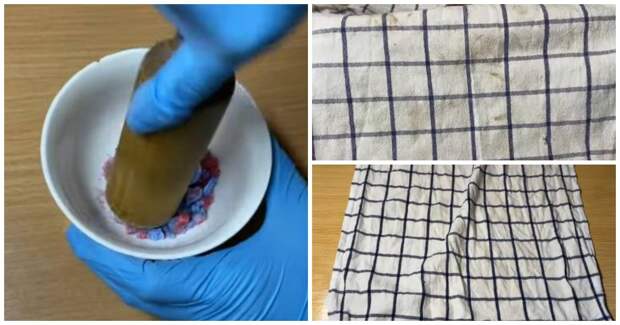 Не выбрасывайте кухонное полотенце, если на нём имеются не отстирываемые пятна. Возьмите всего одну таблетку, измельчите в порошок и залейте кипятком. Полотенце будет как новенькое! Измельчите любым доступным способом одну таблетку для посудомоечной машины. Отправьте порошок в таз к полотенцу. Залейте кипятком и оставьте на час.