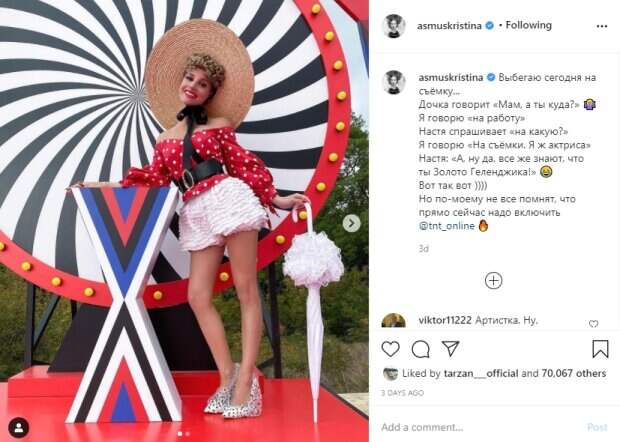 "Выбегаю сегодня на съёмку... Дочка говорит: "Мам, а ты куда?» Я говорю «на работу». Настя спрашивает «на какую?». Я говорю «На съёмки. Я ж актриса» Настя: «А, ну да, все же знают, что ты Золото Геленджика!", - поделилась Кристина в описании. Многие комментаторы пришли в восторг от смелого образа актрисы, хотя нашлись и недовольные критики: "У вас красивый макияж, особенно помада. Цвет супер