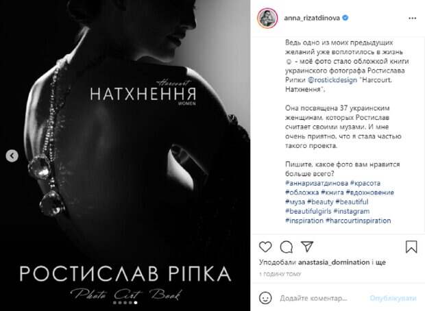 Так, в этот раз красотка поделилась роскошными черно-белыми снимками, а в подписи к ним рассказала о планах на ближайшее будущее. По словам Анны, эти снимки сделал известный украинский фотограф Ростислав Рипка в рамках своего фотопроекта, посвященного 37 украинским женщинам, которых он считает своими музами. Более того, фото Ризатдиновой стало обложкой книги фотографа. На кадрах красотка появилась в разных чарующих образах, демонстрируя свое прекрасное тело и соблазнительные изгибы. В подписи к публикации Анна рассказала о планах: "Что хочу реализовать в ближайшем будущем? Я стараюсь записывать все свои желания. Мне кажется, тогда намного легче воплощать их в реальность. Составила план, что хочу реализовать в ближайшем будущем: 1. Открыть филиалы Академии @rizatdinova.academy – не только в Киеве, но и в других городах Украины. 2. Попробовать себя в роли ведущей. Очень надеюсь, что всё получится". Напомним, Любимица Ямы из "Танців з зірками" после двух операций обратилась к женщинам: "Чтобы потом не пришлось мучиться…". Как сообщала Politeka, Любимица Ямы из "Танців з зірками", родившая сына олигарху, показала праздничные фото: "И вам того желаю!". Также Politeka писала, Фаворитка Ямы из "Танців з зірками" в мини и необычной сеточке показала топ весенних образов: "Шикарные ноги".