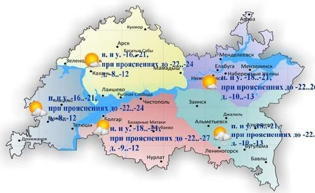 В четверг, 30 декабря, в Татарстане прогнозируется облачная погода с прояснениями. Местами небольшой снег. Ветер юго-восточный умеренный, сообщается на сайте Гидрометцентра РТ. Максимальная температура воздуха днем составит -8... -13 градусов. В Казани ожидается от -8 до -12 градусов. В Набережных Челнах синоптики прогнозируют от -10 до -13 градусов.