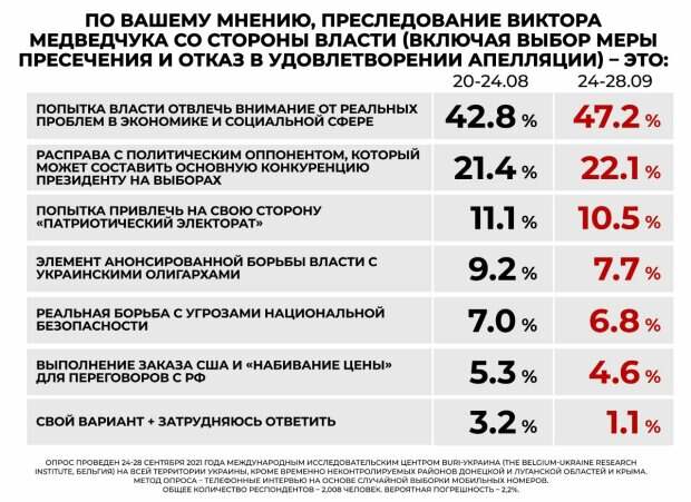 Более 47% украинцев уверены, что преследование властью главы политсовета партии "Оппозиционная платформа - За жизнь" Виктора Медведчука - это попытка отвлечь внимание от проблем в экономике и социальной сфере Об этом говорится в исследовании, проведенном международным исследовательским центром BURI-Украина (The Belgium-Ukraine Research Institute, Бельгия) на протяжении 24-28 сентября 2021 года, пишет 112 Украина.