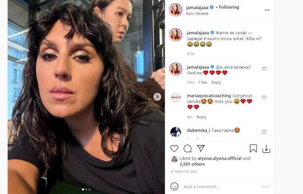 В таком виде Джамала попыталась сделать селфи, однако в кадре неожиданно пояилась ее менеджер Зара Аджарипова. Заметив, чем занимается певица, подруга скорчила на камеру рожицу с высунутым языком, а сама знаменитость просто отодвинулась в сторону. Со второй попытки звезда сумела сделать нормальную фотографию, а ситуацию превратила в поучительную шутку. "Жизнь как cелфи - всегда в него кто-то влезет. Разве нет?", - отметила Джамала в описании. - "@a_zera можна!! Люблю ❤️❤️❤️❤️". В комментариях под постом поклонники восхитились жизненным наблюдением певицы и ее внешним видом: "Очень красивый мейк