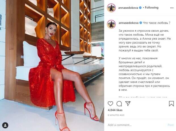 Подол платья задрался, а благодаря откровенному фасону ноги певицы обнажились и показались во всей красе. Она смотрит в камеру, приоткрыв рот и спрятав руки между бедер. "Мне понадобилось много лет, для того, чтоб понять, что для меня любовь. И вчера мой мужчина четко ответил на этот вопрос, отразив все мои чувства в нем", - пишет Седокова. - "Любовь это когда тебе хочется разделить счастье. Своё с ним. Или с ней. Как у Щербакова рассвет) Это когда твой самый счастливый момент не так ярок без него". Пользователи социальной сети оценили необычный образ Анны Седоковой и оставили свои отзывы в комментариях: "Шикарная😍😍😍🔥🔥"; "Обожаю Вас🔥 Вы вдохновляете многих своим примером 💫💫"; "Анна, вы очень красивы❤️🔥"; "Вы такая красивая ❤️"; "Какие ножки 😍🙏🏼"; "Нереально шикарная🔥"; "Роскошная"; "Обворожительная 😍 думаю все со мной согласны 👍🏻"; "Красивый образ"; "Сногсшибательная 🔥"; "Потрясающая! Волшебная! Красавица! ❤️🧡💛💚💙💜🖤💄📿👠". Напомним, счастливая Седокова едва удержала пышные формы в слишком тесном декольте: "Аж вываливаются". Также Politeka писала, что счастливая Анна Седококова официально объявила о помолвке с Янисом Тиммой: "Сказала ему да!". Как сообщала Politeka, Седокова в невидимом бикини без стыда похвасталась умениями молодого жениха.