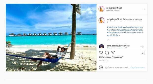 Украинская певица Соня Кей (Соня Хлябич), которая приходится племянницей Софии Ротару, поделилась кадром своего райского отдыха Восходящая звезда вместе с мужем, хоккеистом сборной Украины Олегом Петровым, отдыхала на Мальдивах, сообщает Politeka.net. Супруги вернулись домой, но Соня скучает по райскому отдыху, публикуя соответствующие кадры.