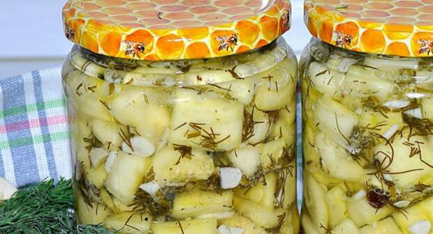 л. с горкой сахара; 2 ст.л. соли (тоже с горкой); 1 ч.л. молотого перца; по 10 горошин черного и душистого перцев; 5 ст.л. рубленного укропа; 5 крупных лавровых листочков; на каждую банку в 0,5 л - по 1 ст.л. укусуса; на каждую банку - 1 ст.л. подсолнечного масла. [caption id="attachment_57864" align="aligncenter" width="750"] Ингредиенты[/caption] Как делать Кабачки помыть, почистить и порезать. Совсем молоденькие можно резать с кожицей. Зелень измельчить, чеснок порубить.Все ингредиенты перемешать, ложкой утрамбовать, накрыть и отправить в холодильник на 3 часа, а лучше на ночь.Дальше разложить по чистым стерилизованным банкам максимально без жидкости, потом залить в каждую по ложке уксуса и масла, до плечиков долить полученного маринада (не больше или все вытечет) и поставить на водяную баню для стерилизации. Крышками просто накрыть.Стерилизовать 10 минут с момента закипания воды в бане. Потом укупорить, пусть остынет.Через сутки можете одну баночку открыть. Вам точно захочется сделать так кабачки еще.