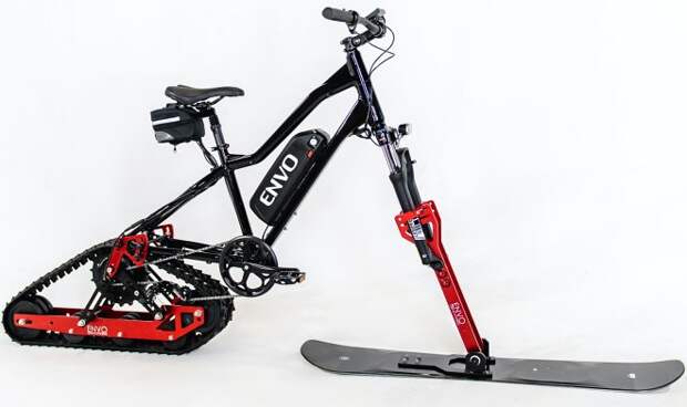 На рынке уже существуют наборы для превращения обычных велосипедов в электробайки и педальные снегокаты. Комплект Electric SnowBike Kit идет дальше и предлагает объединить два этих маневра. Набор выпускается канадской компанией Envo и предназначен для использования с обычными горными велосипедами.