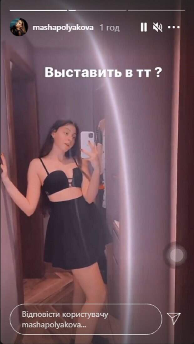 На кадрах видно, что Маша снимает себя на телефон, стоя себя в тусклой комнате, которая напоминает раздевалку. Сначала девочка появилась в кадре в стильном темном бюстгальтере и короткой черной юбке. Она весело подпевает динамичной музыке и в какой-то момент ее образ резко меняется. Так, с пояса Марии исчезает юбка и она остается в лифчике и узких темных трусиках, демонстрируя фигуру и продолжая подпевать. Вскоре девушка приближается к зеркалу, в которое себя снимает, показывая упругие прелести. "Выставить в тт?", - подписала сторис Полякова-младшая. Отметим, что недавно Мария нарвалась на критику в сети, когда выставила видео, в котором показала свой день за несколько секунд. В ролике Маша запечатлена в своей комнате, она показала лицо крупным планом, похвасталась беспроводными наушниками, играла на гитаре, заправляла постель, и занималась своими делами. Перед камерой юная красотка появилась в яркой оранжевой футболке с оригинальным принтом. Ее длинные волосы распущены, а на лице яркий макияж с черными стрелками. И именно макияж стал причиной травли, Машу раскритиковали за неумение рисовать стрелки на глазах. Напомним, что Полякова, вытирая "слезы", покаялась перед Фреймут, Каменских и Монатиком: "Накликала, простите ребята! " Как сообщала Politeka, Оля Полякова в кокетливом халатике объявила, что покидает Украину, раскрыв детали: «Очень хочу…». Также Politeka писала, что мокрая Оля Полякова порезвилась на улице в одном купальнике, жаркие кадры: "с такой не замерзнешь".