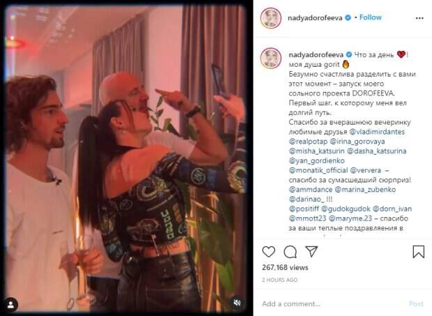 Можно заметить, что девушка не надела бюстгальтер, а волосы собрала в два хвостика. Поздравить исполнительницу приехали знаменитые коллеги, такие как рэпер Потап, Вера Брежнева, Дима Монатик, блогер Ян Гордиенко. Гости пили шампанское и веселились, то и дело целуя виновницу торжества. На празднике был и муж певицы - Владимир Дантес. "Что за день