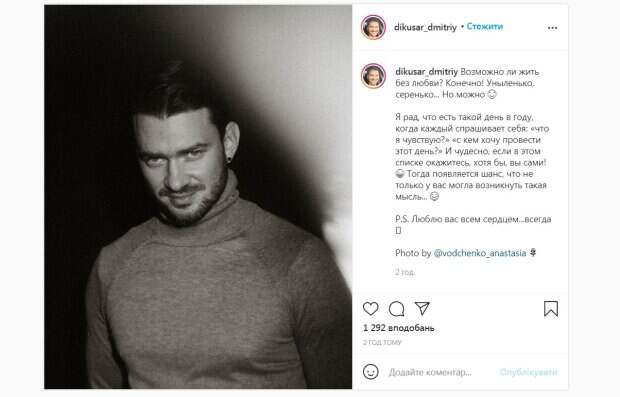 Известный украинский хореограф, участник "Танців з зірками" Дмитрий Дикусар ошеломил признанием Как пишет Politeka.net, у себя в Инстаграм артист порассуждал на тему любви. «Возможно ли жить без любви? Конечно! Уныленько, серенько... Но можно