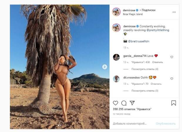 Об этом пишет Politeka.net со ссылкой на страничку знаменитости. "Постоянно развивается, постоянно меняется", - написала звезда под фото. Фанаты поставили более 300 тысяч лайков и написали комментарии: "Наконец-то что-то стоящее", "Постоянно становиться все больше и больше сознания", "Королева острова", "Ты самая главная роза во всем мире", "Не могли бы вы послать мне приветствие?", "Великолепный, чудесно великолепный орешек", "Какая красивая", "Люблю эту картинку любовь", "Желаю тебе удачи в этом". Сообщалось, что модель купальников и нижнего белья Деми Роуз умеет заинтриговать даже кадром из отдыха. В черном купальнике с кружевными вставками девушка выглядела весьма привлекательно, а ее распущенные локоны удачно завершили пляжный образ без дополнительных деталей. Напомним, Деми Роуз растопила сердца, показав главные достоинства фигуры в ванной А еще Politeka писала, что Деми Роуз обтянула свои фантастические объемы прозрачной тканью Также Politeka сообщала, что Деми Роуз подчеркнула выпирающие достоинства крошечным золотым бикини