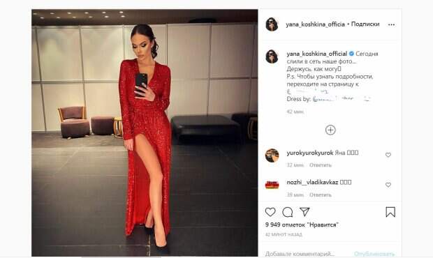 Наряд имел большое декольте и вырез на юбке. Благодаря вырезу в районе груди, можно было заметить пышную грудь, соблазнительно выставившуюся и притягивающую взгляд. В длинном разрезе платья Кошкина выставила длинную ножку в черной туфельке. Макияж с акцентом на глаза дополнил образ и выглядел идеально. "Сегодня слили в сеть наше фото... Держусь, как могу